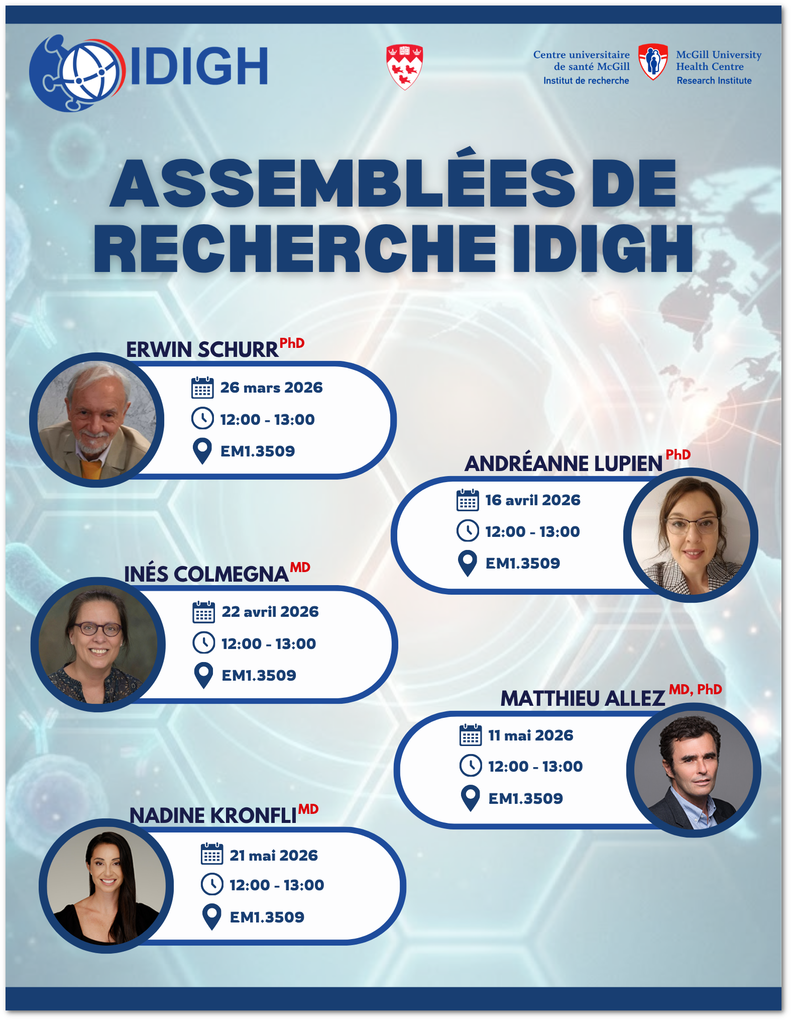 Nous sommes heureux de vous inviter à prendre part à une nouvelle initiative rassembleuse : les Assemblées de recherche IDIGH, un forum dédié à repenser et à façonner l'avenir du programme IDIGH et de ses activités de recherche dans le cadre du nouveau plan stratégique de l'IR-CUSM.